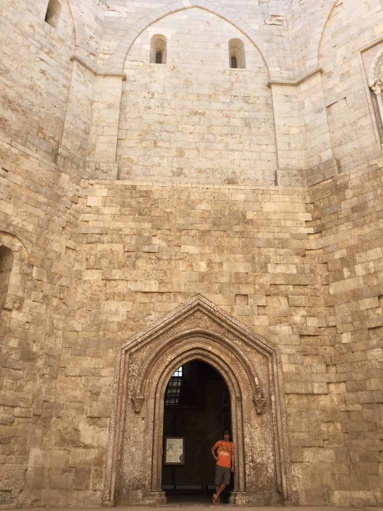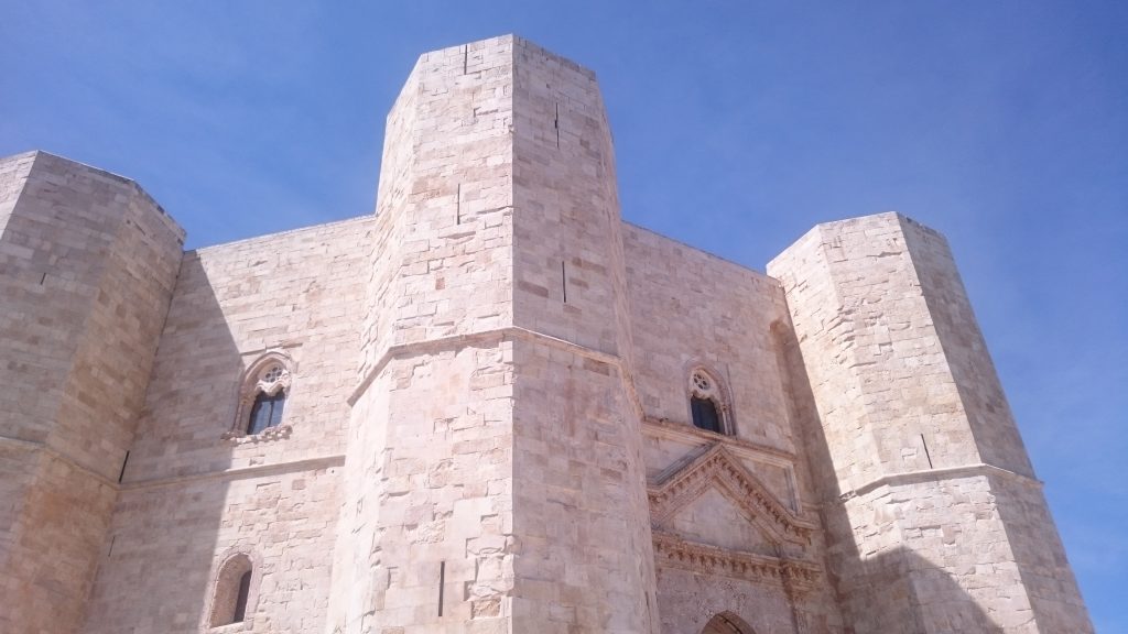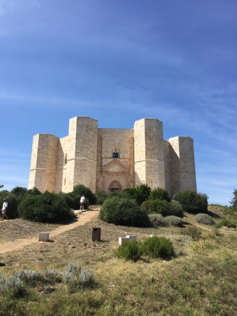 Nous poursuivons ensuite nos pérégrinations en direction de la forteresse Castel del monte. Classée au patrimoine mondial de l’UNESCO, on la surnomme aussi la forteresse aux mystères et on comprend pourquoi. La visite de ce château restera gravée dans ma mémoire tant je n’ai jamais vu son égal. Son originalité réside dans son architecture : une couronne de pierre posée sur une colline à 540 mètres au-dessus du niveau de la mer et dont les plans ont été conçus avec une rigueur géométrique et mathématique extrême. Le plan est octogonal et le chiffre huit se répète de manière quasi obsessionnelle : huit pièces à chaque étage, huit tours imposantes, elles-mêmes octogonales, disposées à chacun des huit angles de l’octogone… Bref que votre chiffre porte bonheur soit le 8 ou non, une visite s’impose. De plus, ne vous fiez pas à sa façade un peu austère, l’intérieur de château vaut vraiment le détour !