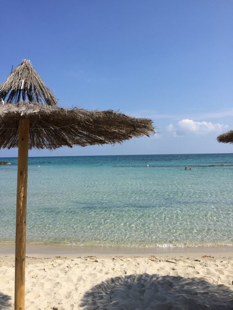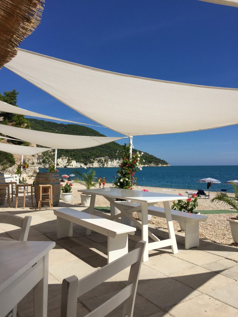 Après avoir pris possession de notre chambre, nous filons directement à la plage. En venant de Vieste, nous avons aperçu l’une des plages les plus célèbres de la région grâce son rocher calcaire dans lequel la mer a creusé une arche. Il s’agit de la Baia delle zagare mais celle-ci n’est malheureusement pas accessible au commun des mortels car réservée principalement aux clients de l’hôtel de luxe qui en contrôle donc l’accès.