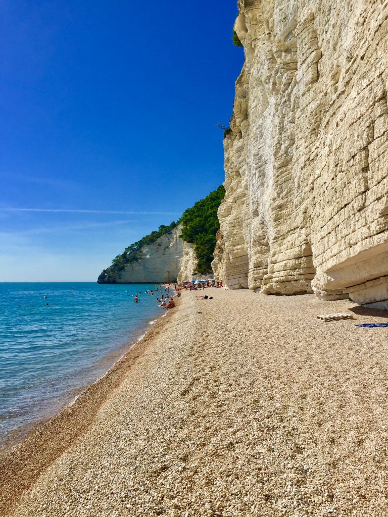C’est donc en début d’après-midi que nous reprenons la route en direction de Mattinata dont le nom fait référence au lever du soleil, Mattinata signifiant « matinée ». La particularité de Mattinata est d’être entourée d’oliviers centenaires et est également reconnue comme étant la « terre des amandes ». On l’appelle aussi le papillon géant du fait de sa forme et de sa couleur blanche de chaux contrastant avec les oliviers. Décidemment elle évoque beaucoup de choses cette ville ! Et en plus de ça, cette petite commune tout à fait charmante dispose de très jolies plages aux eaux cristallines notamment la magnifique Baie de Mergoli (ou des Farglioni), située entre Mattinata et Vignanotica.