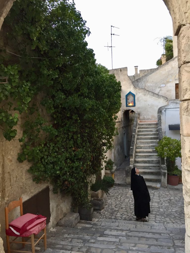 L’architecture de la cité participe aussi à sa superbe et à la fascination qu’elle engendre : construite en hauteur en surplomb d’un profond ravin, c’est une impression de plongeon que l’on ressent lorsque depuis l’église on admire le panorama offrant une vue imprenable sur les sassi. On dit de beaucoup de villes ou villages italiens qu’ils sont labyrinthiques mais je peux vous assurer qu’après avoir visité Matera, vous y réfléchirez à deux fois avant d’employer cet adjectif. Prévoyez d’ailleurs de bonnes chaussures car le lacis de ruelles n’en finit pas de descendre puis remonter mettant à l’épreuve vos cuisses et vos mollets !